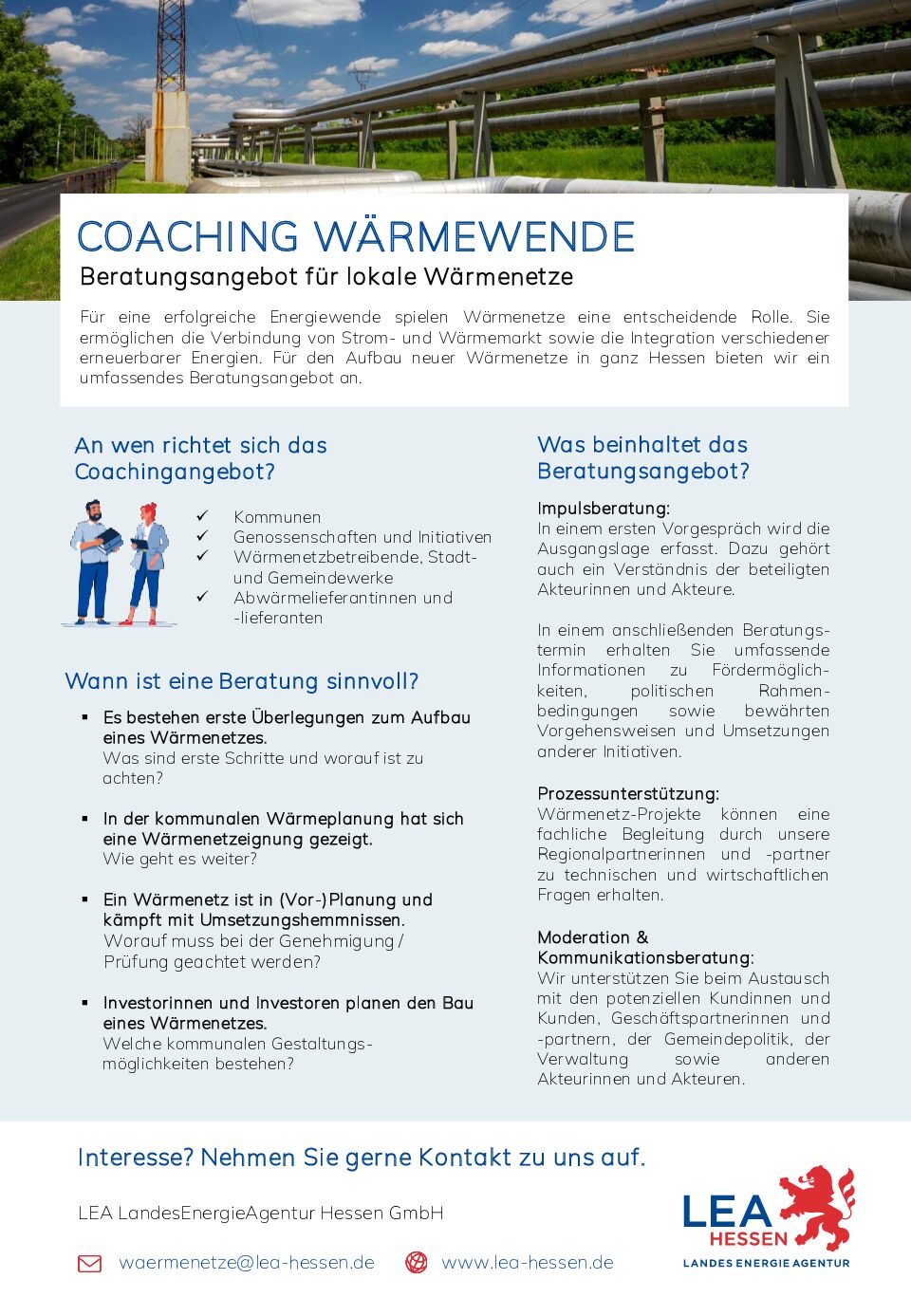 Um die beteiligten Akteure in Hessen auf dem Weg zur Wärmewende zu unterstützen hat die LEA Hessen ein eigenständiges Beratungsangebot entwickelt. Hier liegt der Fokus auf der Unterstützung von lokalen Wärmenetzen, die eine Schlüsselrolle einnehmen: Sie ermöglichen nicht nur die Verbindung von Strom- und Wärmemarkt, sondern auch die Integration verschiedener erneuerbarer Energien.